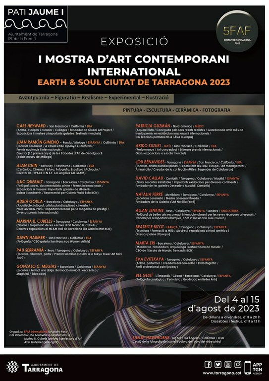 La primera Mostra d’Art Contemporani Internacional s’inaugura aquesta tarda, a les 20h, al Pati Jaume I de l’Ajuntament de Tarragona. Sota el nom "Earth and Soul", l’exposició compta amb obres pictòriques, escultures, ceràmica i fotografia. Es podrà visitar fins al 15 d’agost, de dilluns de divendres d’11 a 20 h i dissabtes d’11 a 13 h. L’entrada és lliure.
