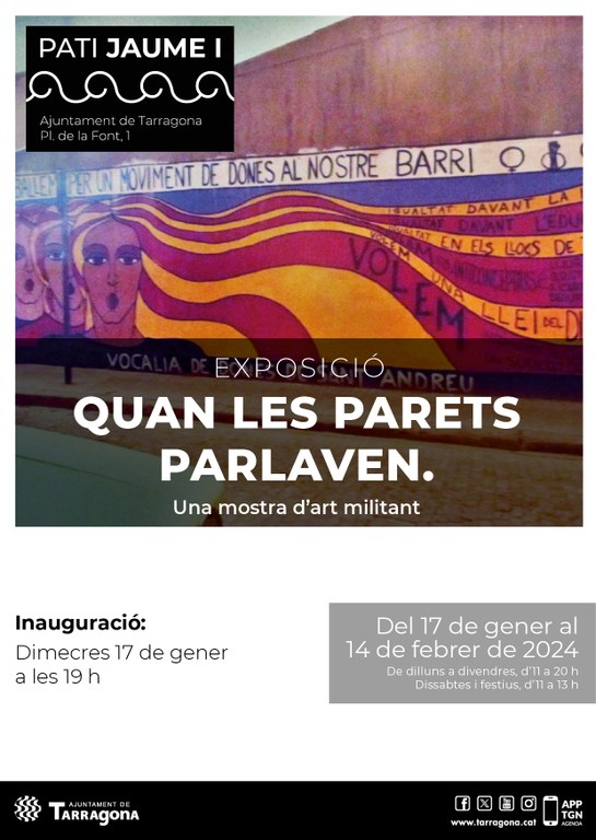 Fins al 14 de febrer la sala d'exposicions del Pati Jaume I acollirà l'exposició, que s'inaugura aquesta tarda, "Quan les parets parlaven. Una mostra d'art militant", que pertany a una col·lecció de fotografies de diversos murs pintats a Barcelona entre 1977 i 1978, que formen part de la memòria política de la transició.