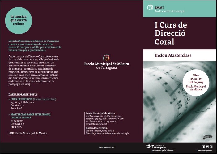 L’Escola Municipal de Música de Tarragona us ofereix el 1r curs de Direcció Coral. Està adreçat a mestres de primària i secundària, estudiants de magisteri, directors/es de cors infantils que s’inicien en el món coral, cantaires i tothom qui tingui formació musical i inquietud per endinsar-se en la tècnica de direcció i la pedagogia d’assaig.