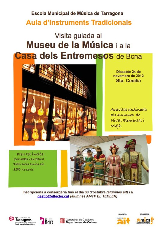 El dissabte 24 de novembre, coincidint amb la festivitat de Sta. Cecília, l'Aula d'Instruments Tradicionals realitzarà una sortida a Barcelona per a visitar dos museus, el Museu de la Música i la Casa dels Entremesos. La visita va dirigida als alumnes de Nivell Elemental de l'Aula d'Instruments Tradicionals.