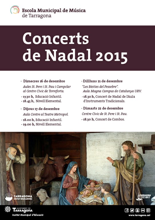 El Nadal també ha arribat a l'Escola Municipal de Música. Per aquesta raó, s'han organitzat quatre concerts dels alumnes de l'Aula Centre, de les Aules de Música als Barris i de l'Aula de Música Tradicional. Avui, dilluns 21, és el torn de l'Aula d'Instruments Tradicionals, que ofereix el concert "Les bèsties del pessebre" a les 18.30 h a l'Aula Magna del Campus Catalunya de la URV. I demà seran els alumnes de combo de les Aules de Música de Sant Pere i Sant Pau i Campclar que actuaran a la mateixa hora al Centre Cívic de Sant Pere i Sant Pau.