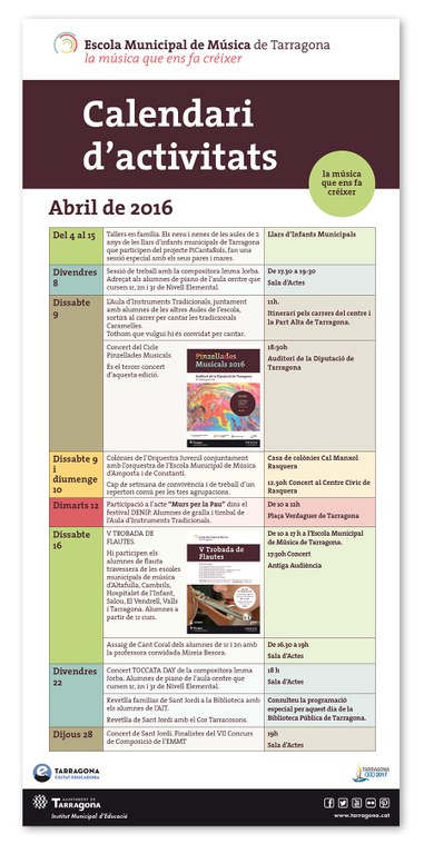 Aquest mes d'abril està farcit d'activitats a relitzar per l'alumnat de l'Escola Municipal de Música de Tarragona.