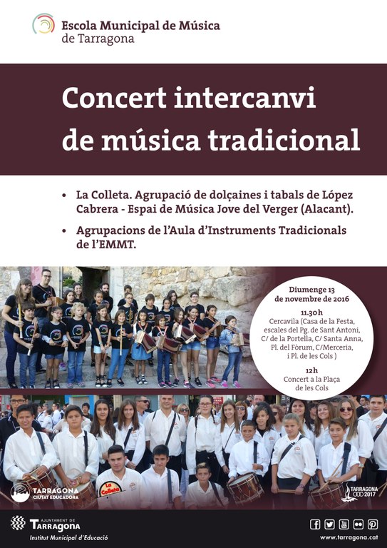 L'Escola Municipal de Música de Tarragona rep aquest proper cap de setmana La Colleta, l'Agrupació de Dolçaines i Tabals de López Cabrera - Espai de Música Jove del Verger (Alacant). El diumenge 13 farem junts una cercavila i un concert a la Plaça de les Cols. Hi participaran les agrupacions de l’Aula d’Instruments Tradicionals de l’EMMT.