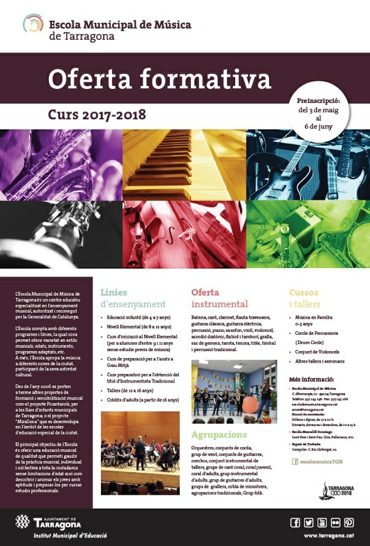 Aquest dilluns comencen les jornades de portes obertes a les diferents instal·lacions de l'Escola Municipal de Música, que actualment es troba en període de preinscripció per al curs vinent. En concret s’ofereixen tres sessions per presentar l’oferta formativa a cadascuna de les seus on s’imparteixen classes de música a la ciutat: aquest dilluns 8 de maig, a les 18 h, Aula Armanyà i Aula d’Instruments Tradicionals (c. Armanyà, 10); divendres 12 de maig, a les 17.30 h, Aula Campclar (c. Riu Llobregat, 10), i dilluns 15 de maig, a les 17.30 h, Aula Sant Pere i Sant Pau (Escola Marcel·lí Domingo a Sant Pere i Sant Pau).