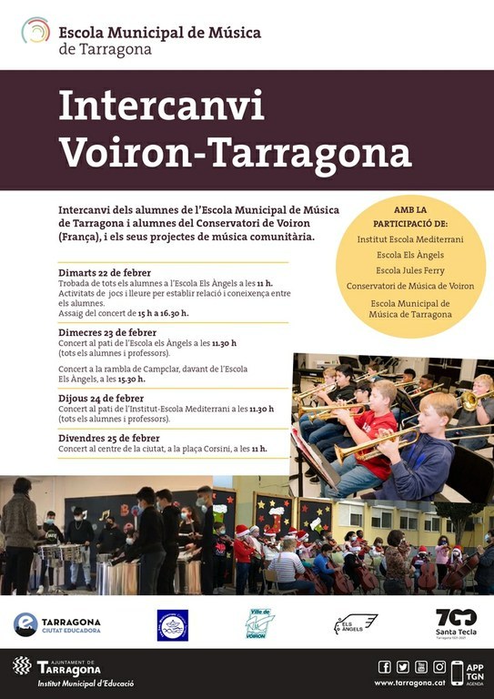 Aquest divendres a les 11 h, a la plaça Corsini, se celebrarà el concert de clausura de l'intercanvi dels alumnes de l'Escola Municipal de Música de Tarragona amb una quinzena d'alumnes del Conservatori de la ciutat francesa de Voiron. Es tracta d'un concert obert a tota la ciutadania. Els joves músics francesos han estat acollits per l'institut escola Mediterrani i l'escola Els Àngels.