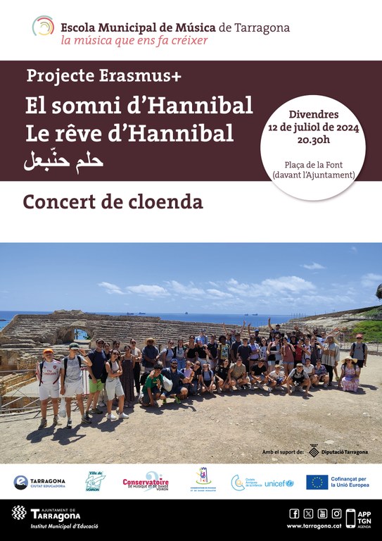 La plaça de la Font acollirà, demà divendres 12 de juliol a les 20.30 hores, el concert de cloenda de l'Erasmus entre l'Escola Municipal de Música de Tarragona (EMMT), el conservatori de música de Monastir (Tunísia) i el conservatori de música Voiron (França). Es tracta del nou projecte anomenat Erasmus Plus Le rêve d'Hannibal en el marc del qual prop d'una seixantena d'alumnes han començat a treballar conjuntament un repertori musical que s'anirà ampliant en cada trobada.