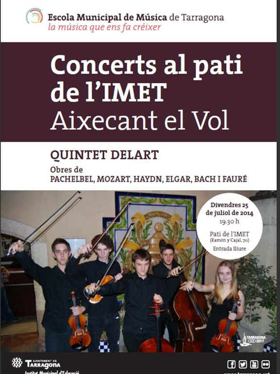 El primer concert de l’estiu serà el divendres 25 de juliol a les 19:30h i anirà a càrrec del Quintet Delart, format pel Javier Olucha i Dani Laoz, violins; l’Aridna Dasca, viola; en Victor Marrugat, cell; i l’Eudald Ribas, contrabaix.