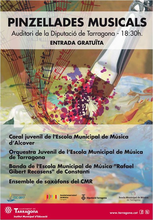 El pròxim 22 de febrer se celebrarà el segon concert de les Pinzellades Musicals 2014. El repertori inclourà diferents peces de música moderna interpretades per la Coral juvenil de l’Escola Municipal de Música d’Alcover, l’Orquestra Juvenil de l’Escola Municipal de Música de Tarragona, la Banda de L’Escola Municipal de Música “Rafel Gibert Recasens” de Constantí i l’Ensemble de saxofons del Conservatori de Música de la Diputació La programació de “Pinzellades musicals 2013”, que va començar el passat 25 de gener ofereix un total de sis concerts amb periodicitat mensual. Tots ells se celebren a l’Auditori de la Diputació de Tarragona. Aquesta és una iniciativa organitzada per l’ Institut Municipal d’Educació de l’Ajuntament amb la col·laboració de l’Escola de Música, el Conservatori de la Diputació de Tarragona i la Fundació Caixa Tarragona. Vol dinamitzar i potenciar la relació entre els diferents centres d’educació musical de les nostres comarques i, específicament, de la ciutat. Hi participen joves fins als 16 anys i tots els centres educatius que ho desitgen.
