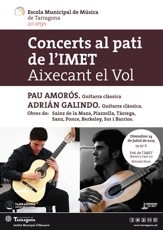 El proper divendres 24 de juliol a les 19.30 h al Pati de l’Institut Municipal d’Educació (C/Ramon i Cajal, 70), Pau Amorós i Adrián Galindo oferiran un concert de guitarra clàssica.