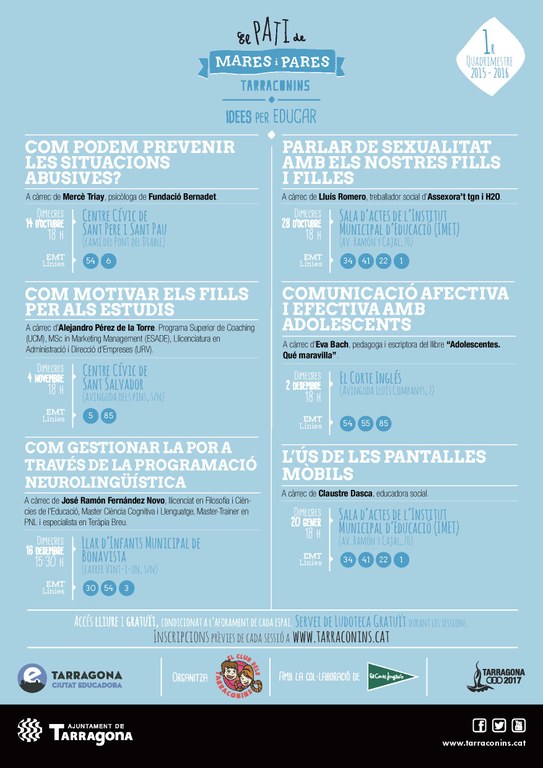 El proper dimecres, 14 d’octubre, comença la nova temporada del Pati de Mares i Pares Tarraconins, que es va crear ara fa un any, i que té com objectiu ajudar en la tasca eductiva i d’aprenentatge dels infants.