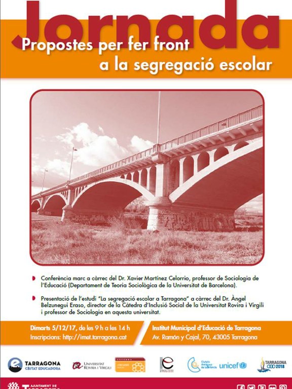 El proper 05 de desembre es presentaran a l'IMET, els resultats generals de l’estudi “La segregació escolar a Tarragona” . A partir d’aquests, es pretén estudiar, reflexionar i proposar mesures d’inclusió social i educativa en les zones de la ciutat amb més complexitat social, així com posar en valor la tasca educativa desenvolupada pels centres docents.