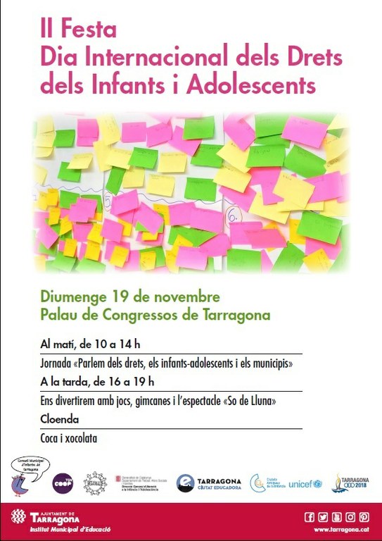 El Palau de Congressos de Tarragona acollirà aquest diumenge, 19 de novembre, la II Festa del Dia Internacional dels Drets dels Infants i Adolescents, promoguda per l'Ajuntament de Tarragona a través a l'Institut Municipal d'Educació i el Consell Municipal d'Infants.