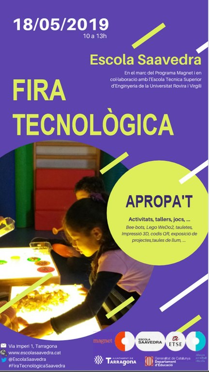 Segueix l’esdeveniment amb l’etiqueta de twitter #FiraTecnòlogicaSaavedra o al web https://agora.xtec.cat/ceipsaavedra/