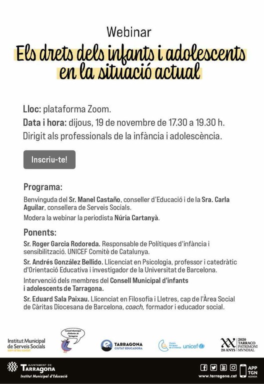 L’Ajuntament de Tarragona en el marc de la Taula d'infància i adolescència liderada per l’Institut Municipal d’Educació i l'Institut Municipal de Serveis Socials, ha organitzat el seminari en línia “Els drets dels infants i adolescents en la situació actual” el proper dia 19 de novembre, de 17.30 h a 19.30 h, a través de la plataforma Zoom.