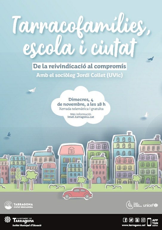 L’Institut Municipal d’Educació de Tarragona organitza el webinar “Tarracofamílies, escola i ciutat” el proper dia 4 de novembre a les 6 de la tarda a la plataforma Zoom.