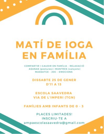 El proper dissabte 25 de gener l'AMPA Saavedra us convida a conèixer l'escola i gaudir d'un matí de ioga en família