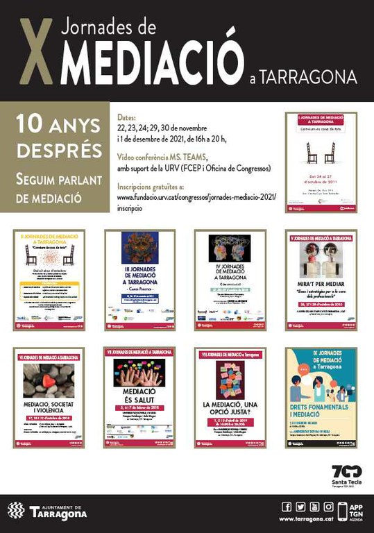 Enguany se celebra la desena edició d’aquestes Jornades de Mediació a Tarragona, amb el títol “Deu anys després seguim parlant de mediació”, les quals son un punt de trobada per a la promoció del diàleg entre les persones i grups socials en la gestió de les discrepàncies i els conflictes comunitaris i privats, en àmbits molt diversos com: l’educatiu, l’educació social, la convivència social i veïnal, la família, la justícia, el mon laboral, el treball i les relacions socials i laborals, la psicologia, la pedagogia, la salut, l’empresa etc.