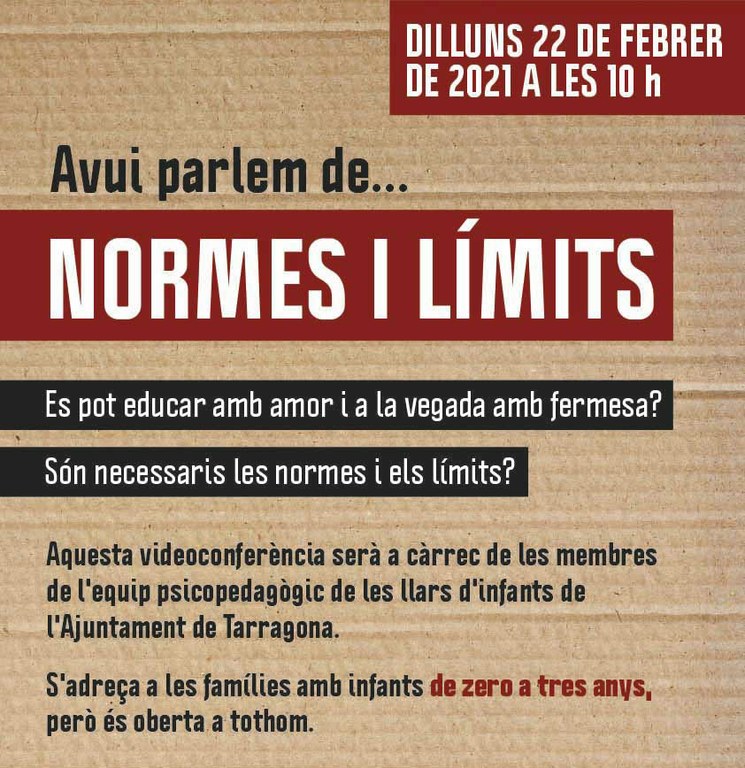 L’Institut Municipal d’Educació de Tarragona (IMET) ofereix per al proper dilluns 22 de febrer la xerrada “Normes i límits”, adreçada bàsicament a famílies que tenen infants que assisteixen a les llars d’infants municipals (és a dir, infants de zero a tres anys), però oberta a tothom que vulgui participar-hi.