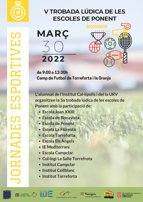 Es tracta d’una trobada d’alumnes de 6è de primària i 1r ESO de 10 centres educatius de la zona de Ponent de Tarragona. Hi participaran un total de 700 alumnes de l’Institut Collblanc, l’Escola Bonavista, l’Institut Escola Mediterrani, el Col·legi Joan XXIII, l’Escola Campclar, l’Escola Els Angels, l’Escola La Floresta, l’Institut Torreforta, l’Escola Torreforta i el Col·legi la Salle-Torreforta.