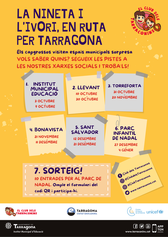 Aquest dilluns s’inicia una nova activitat del Club dels Tarraconins, es tracta d’una ruta sorpresa per Tarragona. Els capgrossos del club s’amagaran fins el desembre en diferents equipaments municipals dels barris de la ciutat i els infants hauran de seguir les pistes a les xarxes socials per trobar-los.
