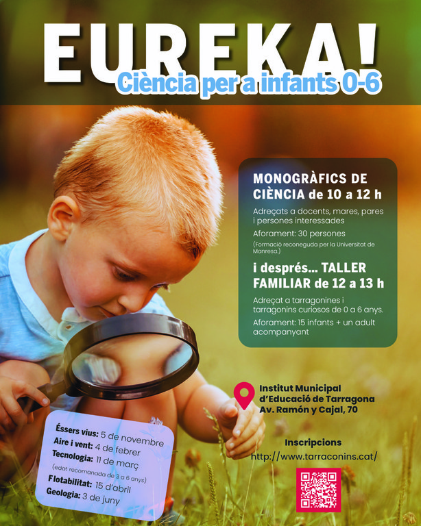 L’Institut Municipal d’Educació de Tarragona (IMET) impulsa les jornades Eureka! per potenciar l’aprenentatge de ciència en infants de zero a sis anys amb tallers i monogràfics. Des del mes de novembre i fins al juny de 2023 tindran lloc cinc jornades a la seu de l’IMET