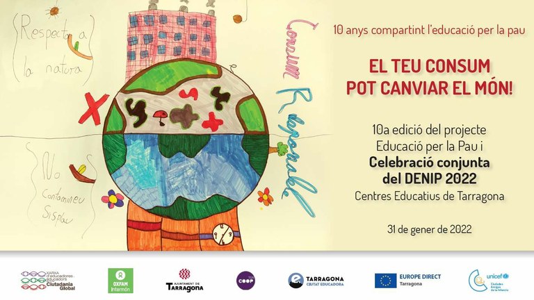 El proper dilluns 31 de gener amb motiu del Dia Escolar de la No Violència i la Pau (DENIP) tindrà lloc l’acte “El teu consum pot canviar el món!”, una celebració conjunta dels centres educatius de Tarragona del DENIP —que enguany es realitzarà via web a causa de la situació sanitària.