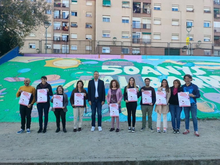 La presentació del projecte Patis Oberts s'ha dut a terme aquest dimecres al pati de l'escola de Sant Pere i Sant Pau, concretament davant del gran mural que es va pintar l'any passat amb motiu del 50è aniversari del barri i de l'escola, una actuació artística que va anar a càrrec de l'artista Justo Heras Megan.