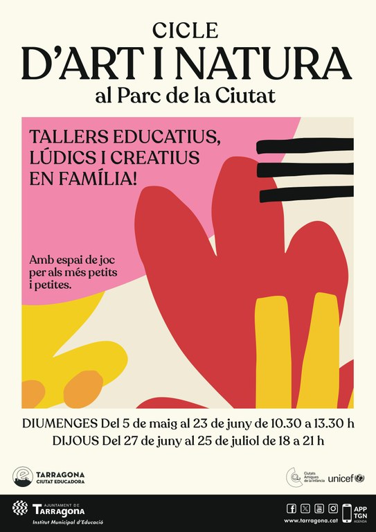 L'Institut Municipal d'Educació Tarragona (IMET) posa en marxa, a partir d'aquest diumenge 5 de maig, el cicle d'art i natura que tindrà lloc a l'espai de La Guingueta del Parc de la Ciutat. L'activitat, gratuïta i sense inscripció prèvia, oferirà tallers educatius, lúdics i creatius; i s'adreça a infants a partir de tres anys. El cicle també ofereix una activitat de joc i experimentació per a la petita infància (infants de zero a tres anys).