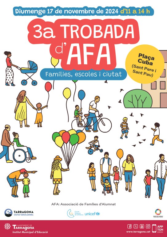 La tercera Trobada d’Associacions de Famílies d’Alumnat (AFA) de Tarragona tindrà lloc el proper diumenge 17 de novembre a la Plaça Cuba, de Sant Pere i Sant Pau, des de les 11h i fins les 14h.