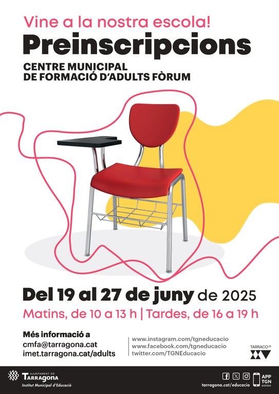 Aquest dijous, 19 de juny, s’obre el període de preinscripció al Centre Municipal de Formació d’Adults (CMFA) Fòrum. Aquelles persones interessades en reprendre els seus estudis o seguir formant-se tenen l’oportunitat de fer-ho en els ensenyaments de persones adultes. Tots els majors de 18 anys interessats en incorporar-se com a alumnes el pròxim curs 2025-2026 poden presentar la sol·licitud de forma presencial al mateix centre (a l’avinguda Ramon i Cajal, 70) demanant cita prèvia en aquest enllaç. L’últim dia per preinscriure’s és el 27 de juny.