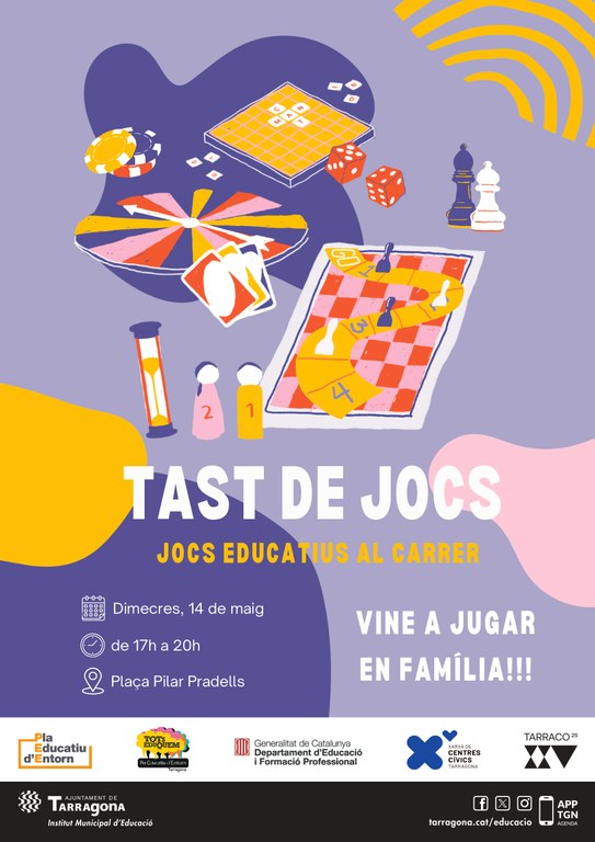 Aquest dimecres 14 de maig se celebrarà la segona edició del “Tast de Jocs. Jocs Educatius al carrer”, una jornada educativa que té com a objectius oferir una proposta d’activitats extraescolars de qualitat, diversa i equitativa; contribuir a l’èxit educatiu d’infants i joves del municipi i, per últim, connectar la potència educativa del territori des d’una perspectiva d’educació a temps complet.