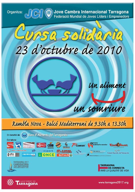 Aquest dissabte dia 23 d’octubre, se celebrarà a la Rambla Nova la Cursa Solidària i Educativa “Un aliment, un somriure” organitzada per la Conselleria d’Esports i la Jove Cambra Internacional. Els protagonistes seran els alumnes dels centres educatius d’infantil i primària de la ciutat que recorreran quilòmetres que es traduiran en donacions de diners i aliments en benefici del Banc d’Aliments del Tarragonès.