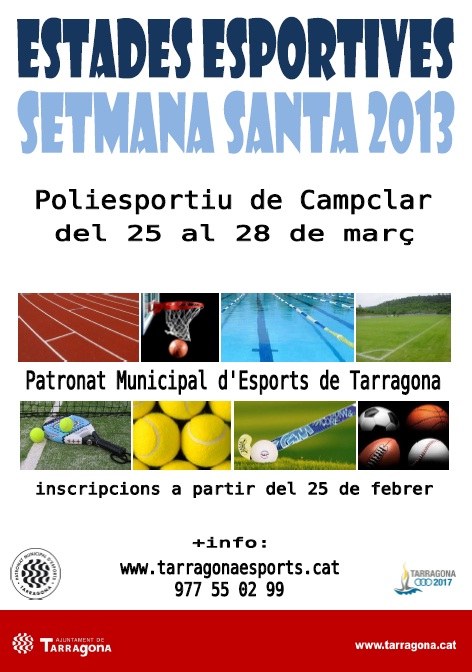 El Patronat Municipal d’Esports de Tarragona organitza Estades Esportives amb motiu de les vacances de Setmana Santa, a les instal·lacions municipals de Campclar. Es tracta d’una proposta de caire recreatiu adreçada a nens i nenes d’entre 4 i 12 anys, amb jocs preesportius i aquàtics, i activitats de psicomotricitat i expressió així com tallers didàctics, pels més petits.