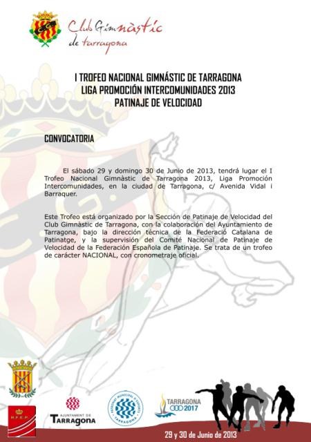 En primer lloc es celebrarà l'Interlliga dissabte a partir de les 14 h, un trofeu per Comunitats Autònomes puntuable; i diumenge es durà a terme el I Trofeu Nacional de Patinatge de Velocitat Nàstic de Tarragona des de les 10 del matí fins les 15 h. Aquestes dues competicions comptaran amb la participació d'uns 400 patinadors de tot l'Estat, tant federats com populars, que passaran a la nostra ciutat tot el cap de setmana. També comptarà amb l'assistència de patinadors de la ciutat i categories populars de participants d'escoles. Segons ha informat la representant directiu del Club Gimnàstic de Tarragona, Alexandra Palos, “l’esdeveniment compta amb un total de 292 inscrits que participaran a les proves oficials”.