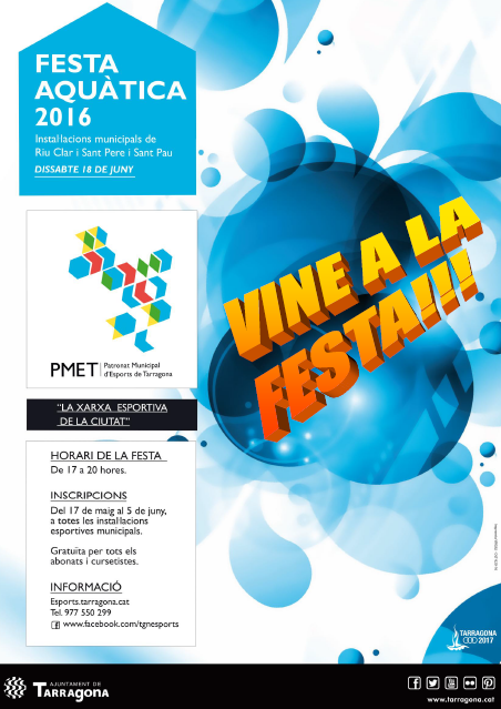 Aquest dissabte 18 de juny a la tarda les piscines de les instal·lacions esportives municipals de Riu Clar i Sant Pere i Sant Pau acullen la segona edició de la Festa Aquàtica. Es tracta d'una activitat de final de curs adreçada a tots els participants dels cursets de prenadons, nadons, preinfantl i infantil.
