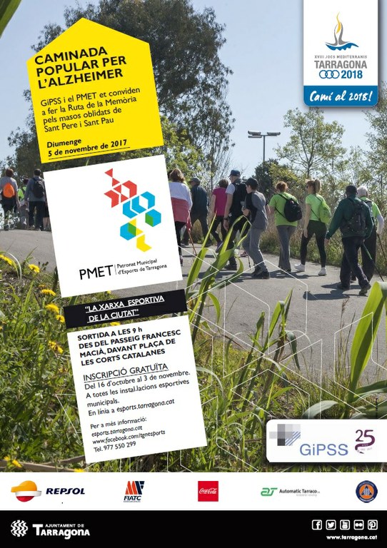 El Patronat Municipal d’Esports (PMET) i l’empresa de Gestió i Prestació de Serveis de Salut (GiPSS) organitzen conjuntament el diumenge 5 de novembre una caminada popular per l’Alzheimer amb motiu de l’arribada de la tardor i el 25è aniversari del GiPSS. Les inscripcions per prendre-hi part s’obren aquest dilluns 16 d’octubre.