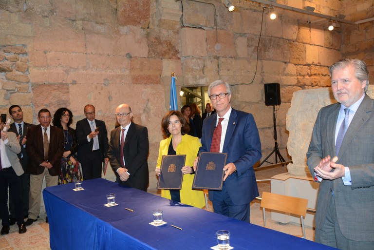 L’alcalde de Tarragona, Josep Fèlix Ballesteros, i la vicepresidenta del govern central, Soraya Sáenz de Santamaría, han formalitzat l’acord de col·laboració entre el Consejo Superior de Deportes i l’Ajuntament de Tarragona per al finançament dels XVIII Jocs Mediterranis Tarragona 2018. L’acte, que també ha comptat amb la presència del Ministre d’Hisenda i Funció Pública, Cristóbal Montoro, i del ministre d’Educació, Cultura i Esports, Íñigo Méndez de Vigo, ha tingut lloc aquest dimarts a la Sala del Sarcòfag d’Hipòlit del Pretori de Tarragona, en un acte davant del Comitè Organitzador dels Jocs Mediterranis i representants de les empreses patrocinadores de l’esdeveniment.