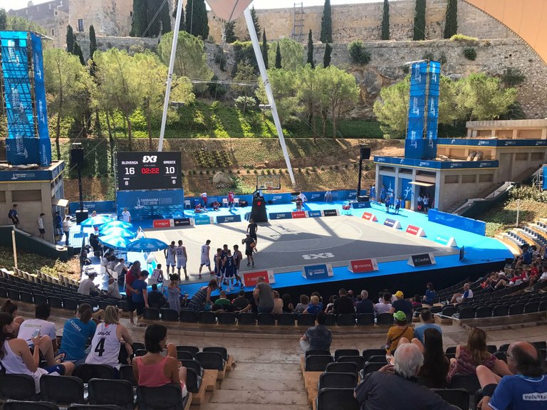 Durant el desenvolupament de la competició de bàsquet 3 x3, que ha començat aquest matí a l’Auditori del Camp de Mart de Tarragona, s’ha produït un desajustament a les plaques que sostenen l’entarimat.