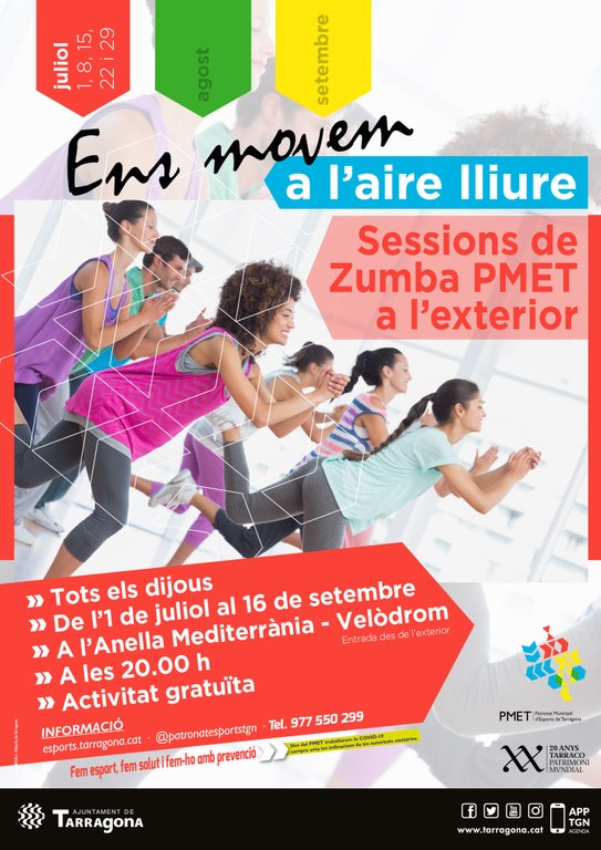 El Patronat Municipal d’Esports de Tarragona (PMET) engega de nou el programa estiuenc “Ens movem a l’aire lliure”, que ofereix sessions de zumba de forma gratuïta a la zona del velòdrom de l’Anella Mediterrània. L’activitat a l’aire lliure comença l’1 de juliol i finalitza el 16 de setembre i la inscripció es pot realitzar 15 minuts abans de cada sessió al mateix espai.