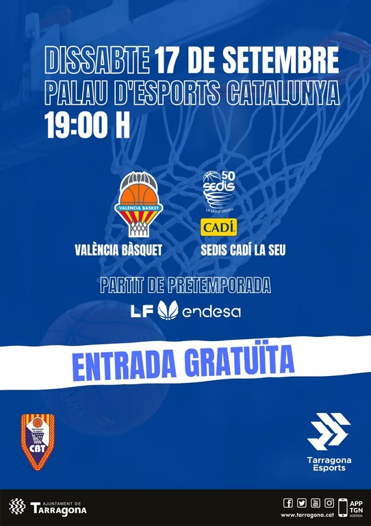 El pròxim dissabte 17 de setembre, a les 19 h, el Palau d’Esports Catalunya acollirà el partit de pretemporada de la lliga femenina de bàsquet entre el València Bàsquet i el Sedis Cadí La Seu. Aquest esdeveniment coorganitzat per Tarragona Esport i el Club Bàsquet Tarragona, estrenarà la temporada esportiva del palau, que els dies 20 i 21 de setembre serà la pista de les semifinals i final de la Lliga Catalana ACB AON.