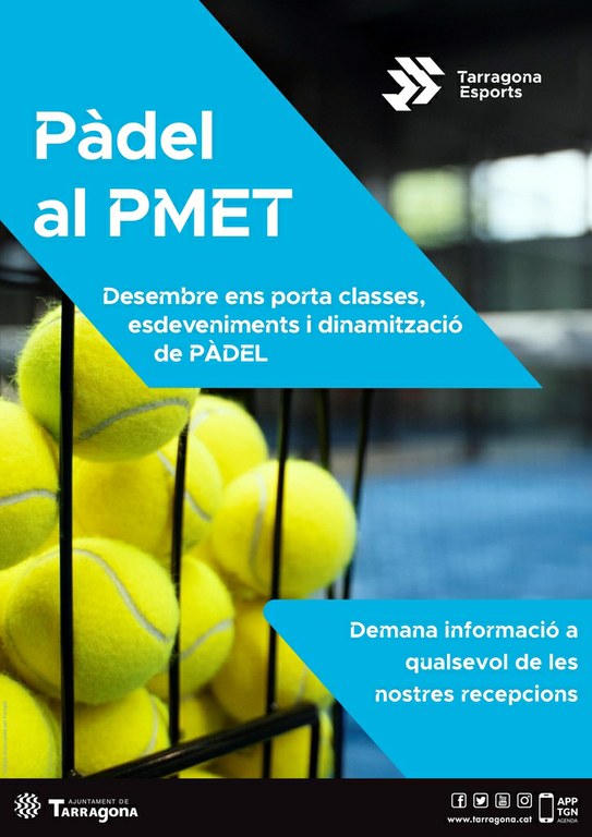 Les classes de pàdel s’oferiran en les instal·lacions esportives municipals de Bonavista, el Serrallo, Sant Salvador i Sant Pere i Sant Pau. Les persones interessades tant en la formació com en els pròxims torneig es poden apuntar presencialment a qualsevol dels sis complexos esportius del Patronat Municipal d’Esports de Tarragona (PMET), des d’on se’ls informarà dels horaris i dels preus públics de l’activitat.
