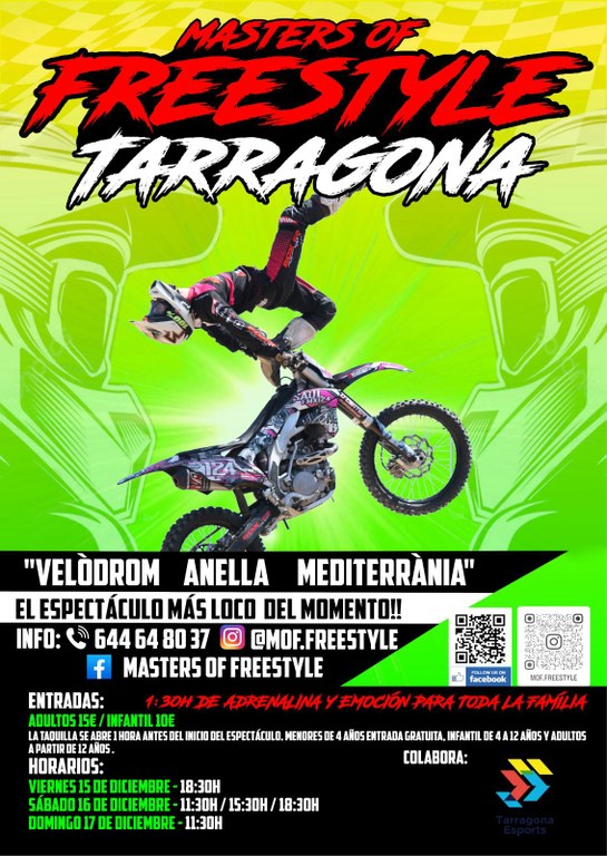 A partir d'aquest divendres 15 i fins al diumenge 17 de desembre, Tarragona acollirà la prova Masters of Freestyle, un espectacle de motor en què es podrà gaudir de grans actuacions i acrobàcies al velòdrom municipal de l’Anella Mediterrània. Es tracta d'un esdeveniment de primer nivell en motociclisme que espera una afluència, durant els tres dies d'espectacle, d'unes 2.500 persones i que compta amb la col·laboració de l’Ajuntament de Tarragona a través de Tarragona Esports.