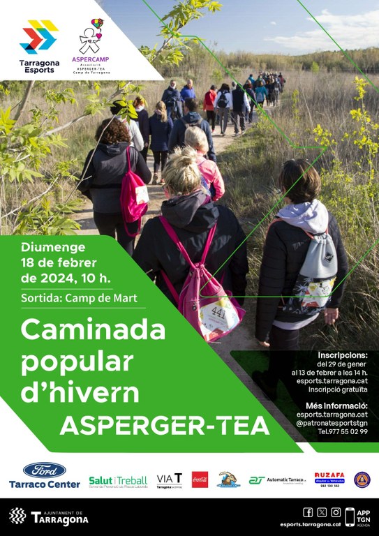 La Caminada Popular d'Hivern Asperger-TEA ha arribat al màxim de participants admesos i aquest diumenge 18 de febrer més de 700 persones participaran en aquest esdeveniment, que enceta el calendari d'activitats esportives a l'aire lliure d'aquest 2024. L'esdeveniment, organitzat per Tarragona Esports i l'Associació Asperger-TEA del Camp de Tarragona (Aspercamp), sortirà pocs minuts després 10 h des del Camp de Mart, ja que abans, al mateix lloc, es farà la lectura conjunta del manifest amb motiu del Dia Internacional de la síndrome d'Asperger, que se celebra cada 18 de febrer. En la lectura hi participaran diversos consellers i conselleres municipals; membres d'Aspercamp i representants de diverses entitats patrocinadores de la caminada. L'encarregada d'obrir aquest acte serà la consellera d'Igualtat, Serveis a la Ciutadania i Serveis Socials, Cecilia Mangini.