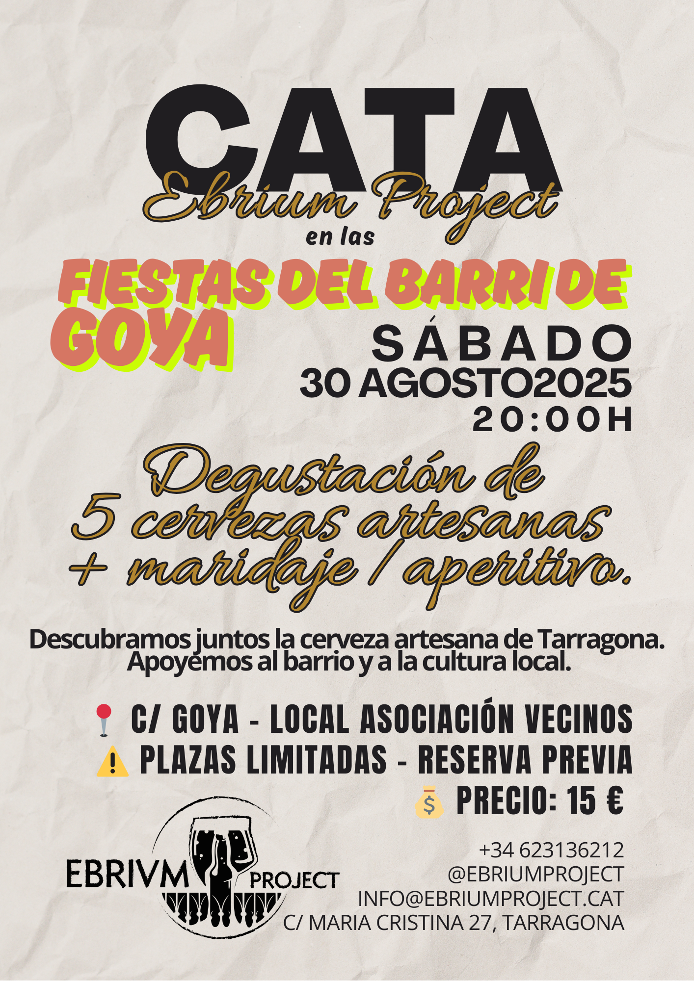 En el marc de les Festes del Barri de Goya 2025, l’Associació Ebrium Project i l’Associació de Veïns del Barri de Goya organitzem el primer tast de cervesa artesana del barri.