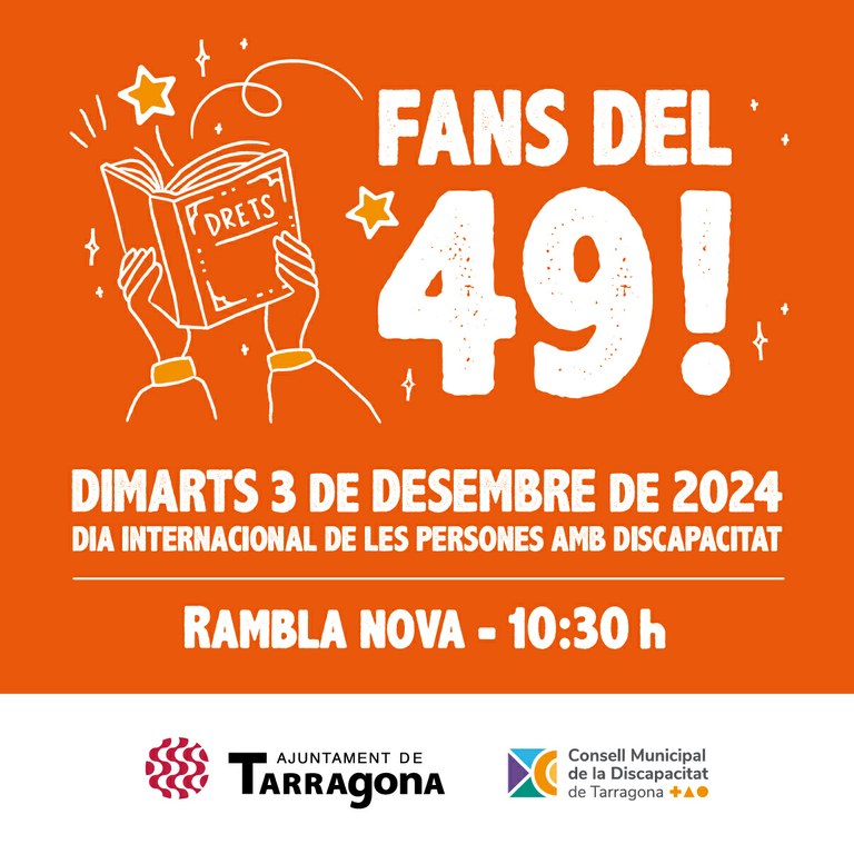 Amb motiu del Dia internacional de les persones amb discapacitat, que se celebra el 3 de desembre, enguany l’Ajuntament de Tarragona ha preparat una sèrie d’activitats que clouen a finals de desembre, però que demà al matí tenen el seu dia més destacat. Des de les 10.30h del matí a la Rambla Nova, davant del Banc d’Espanya, es podrà gaudir d’una jornada festiva amb el lema fans del 49, en relació a l’Article 49 de la Constitució Espanyola que defineix, entre altres conceptes, que “les persones amb discapacitat exerceixen els drets previstos en aquest títol en condicions de llibertat i igualtat reals i efectives”.
