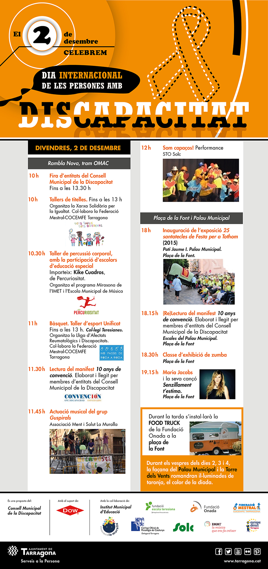 Avui Tarragona celebra el Dia Internacional de les persones amb discapacitat i la Rambla Nova n’acull els actes centrals. A les 10 del matí s’obrirà la Fira d’entitats del Consell Municipal de la Discapacitat a la Rambla Nova, ubicada entre els carrers Comte de Rius i Sant Francesc, i durant el matí s’han organitzat activitats com tallers de titelles, de percussió corporal i de bàsquet. A les 11:30h és realitzarà la lectura del manifest “10 anys de convenció” elaborat i llegit per membres de les entitats que integren el Consell Municipal de la Discapacitat. I a continuació, actuarà el grup musical Guspirals i el grup STO Solc realitzarà la performance “Som capaços!”.