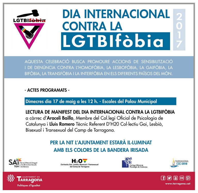 Demà Tarragona se suma als actes de celebració del Dia Internacional contra la LGTBIfòbia. A les 12 h a les escales del Palau Municipal es realitzarà la lectura del Manifest, a càrrec d'Araceli Baillo, membre del Col·legi Oficial de Psicologia de Catalunya i Lluís Romero, tècnic d'H2O Col·lectiu Gai, Lesbià, Bisexual i Transexual del Camp de Tarragona. A la nit, la façana de l'Ajuntament s'il·luminarà amb els colors de la bandera irisada.