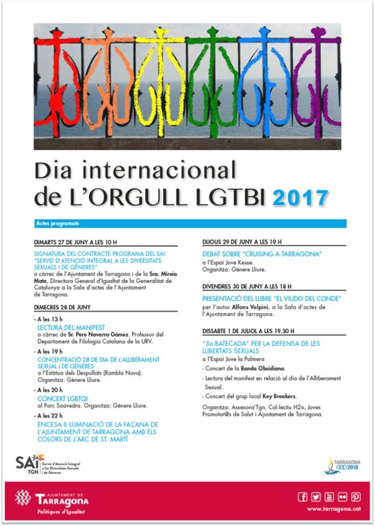 El dimecres, la jornada s'iniciarà amb la lectura del manifest que anirà a càrrec de Pere Navarro, professor del departament de Filologia Catalana de la URV. A les 7 de la tarda, l'Estàtua dels Despullats a la Rambla Nova serà escenari de la concentració del Dia de l'Alliberament sexual i de gèneres. A les 20 h, al Parc Saavedra se celebrarà un concert. A la nit, la façana del Palau Municipal s'il•luminarà amb el color de l'arc de Sant Martí.