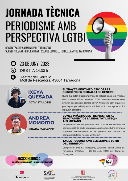 El Servei d’Atenció Integral a les diversitats sexuals i de gèneres de l’Ajuntament de Tarragona, SAI Tarragona, ha programat una jornada tècnica adreçada a professionals titulada Periodisme amb perspectiva LGTBI, que tindrà lloc aquest divendres dia 23 de juny al Teatret del Serrallo. La jornada, que es durà a terme entre les 9 i les 14.30 h, té l’objectiu de donar a conèixer les realitats LGTBI i donar eines que permetin introduir la perspectiva LGBTI en l'àmbit periodístic de forma diferenciada a com s'ha introduït fins ara la perspectiva de gènere.