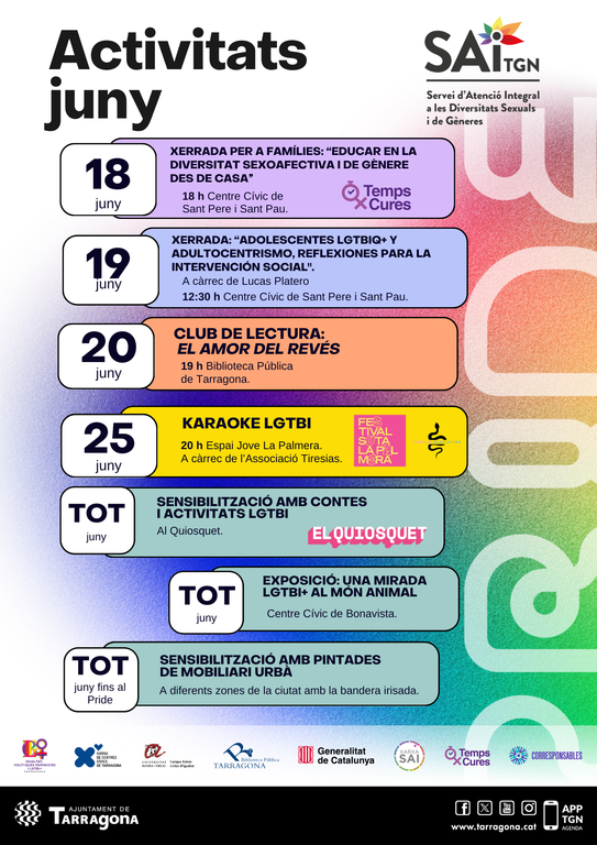 Les activitats continuaran aquest dijous 20 de juny a la Biblioteca Pública de Tarragona on, a partir de les les 19 h, tindrà lloc el Club de lectura amb el llibre El amor del revés. I el dimarts 25 de juny a les 20 h, a l'Espai Jove La Palmera es durà a terme el Karaoke LGTBI a càrrec de l'Associació Tiresias.